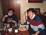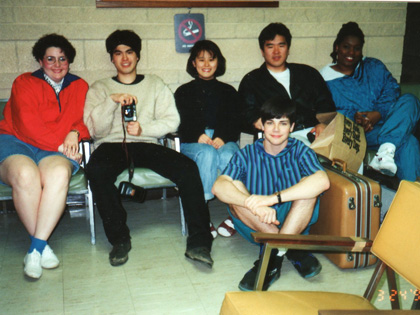 日本へ帰って来る時の見送りの写真 左からケリー、親友の岩部、現在岩部の奥さんの果穂ちゃん、前に座っているのが親友のブライアン、私の隣がブライアンの友達のエイプリルです。岩部は今、サウス・カロライナで新聞記者をしてます。ブライアン4歳位年下ですが留学して初めに出来た友達です。彼は成績が学年で常にトップでした。ほぼ毎日どちらかの部屋に行って色々な事について話をしていたので、勉強になったし、また英語も上達したので彼には本当に感謝してます。 |