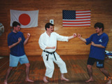 空手の練習の写真 空手着を着た同期生のグレッグ(アメリカ人)が先生で、習っているのが日本人と変な関係でしたが、とても楽しかったです。 |
